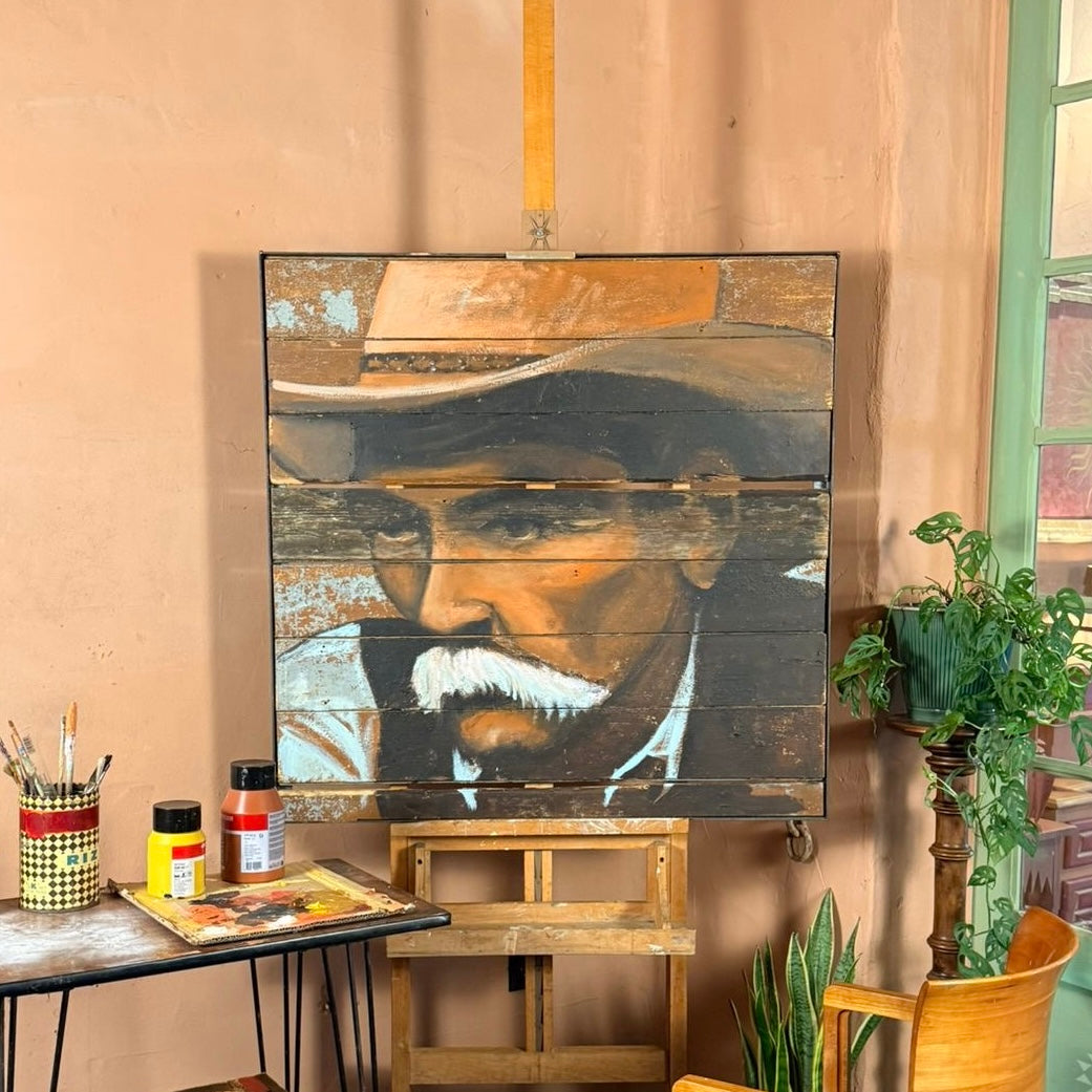 Mixed media on wood in iron frame